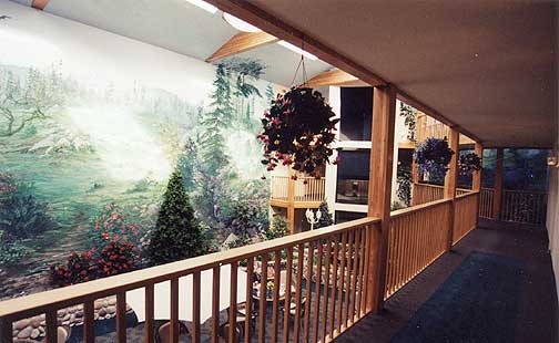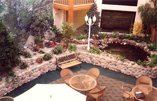 a 3-story atrium with life size forest murals, fishpond, glass elevator and scenic stairways.
